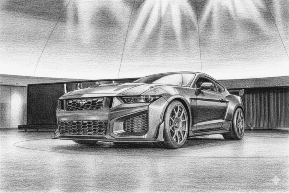 Bagian depan tetap mempertahankan identitas Mustang, namun dengan karakter yang jauh lebih galak. Gril yang lebih lebar dan rendah dipadukan dengan bukaan udara besar di sekitarnya, memberi kesan kemampuan pendinginan serius. Keseluruhan tampilan depan terlihat seperti predator yang siap menerkam.